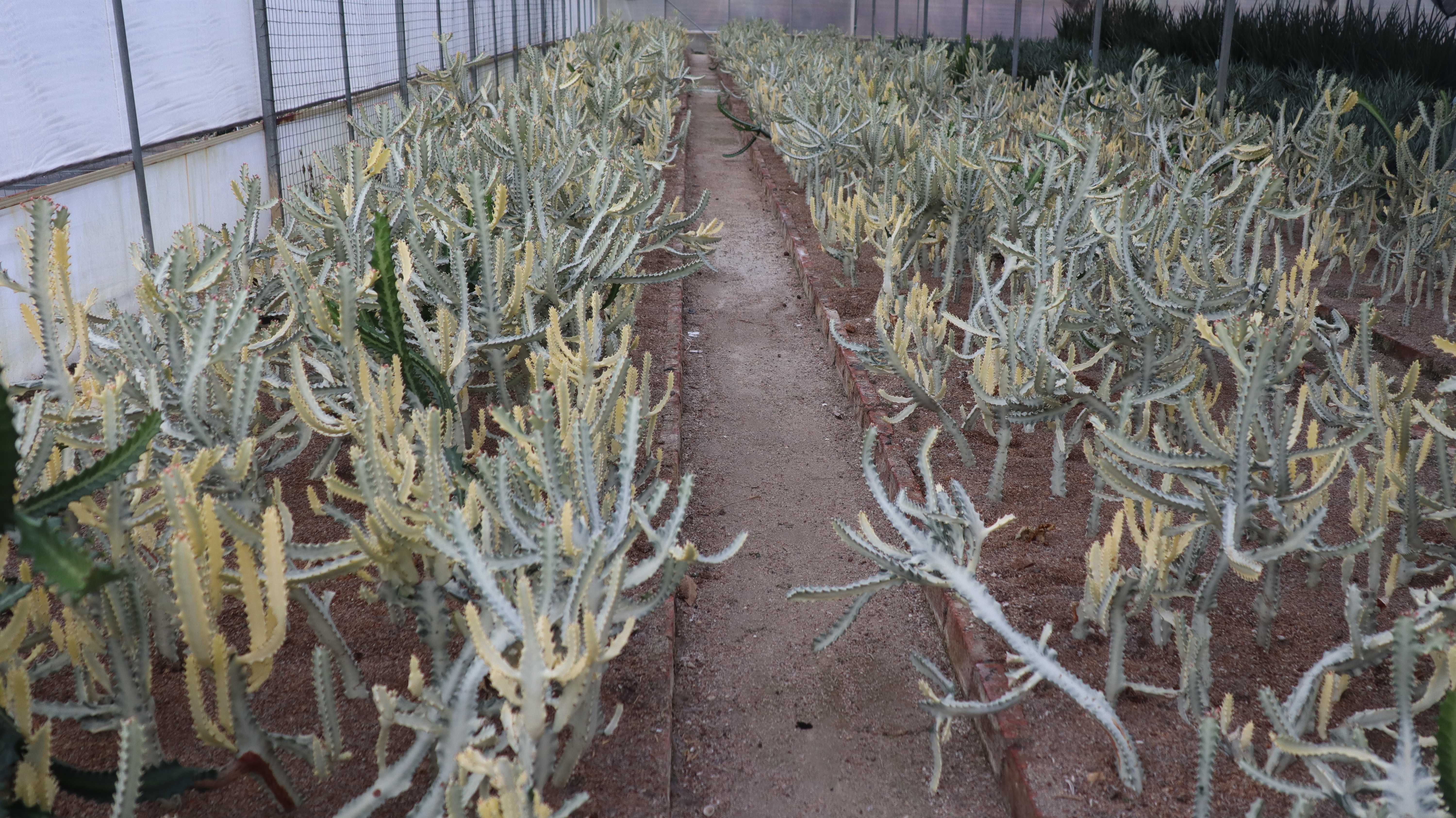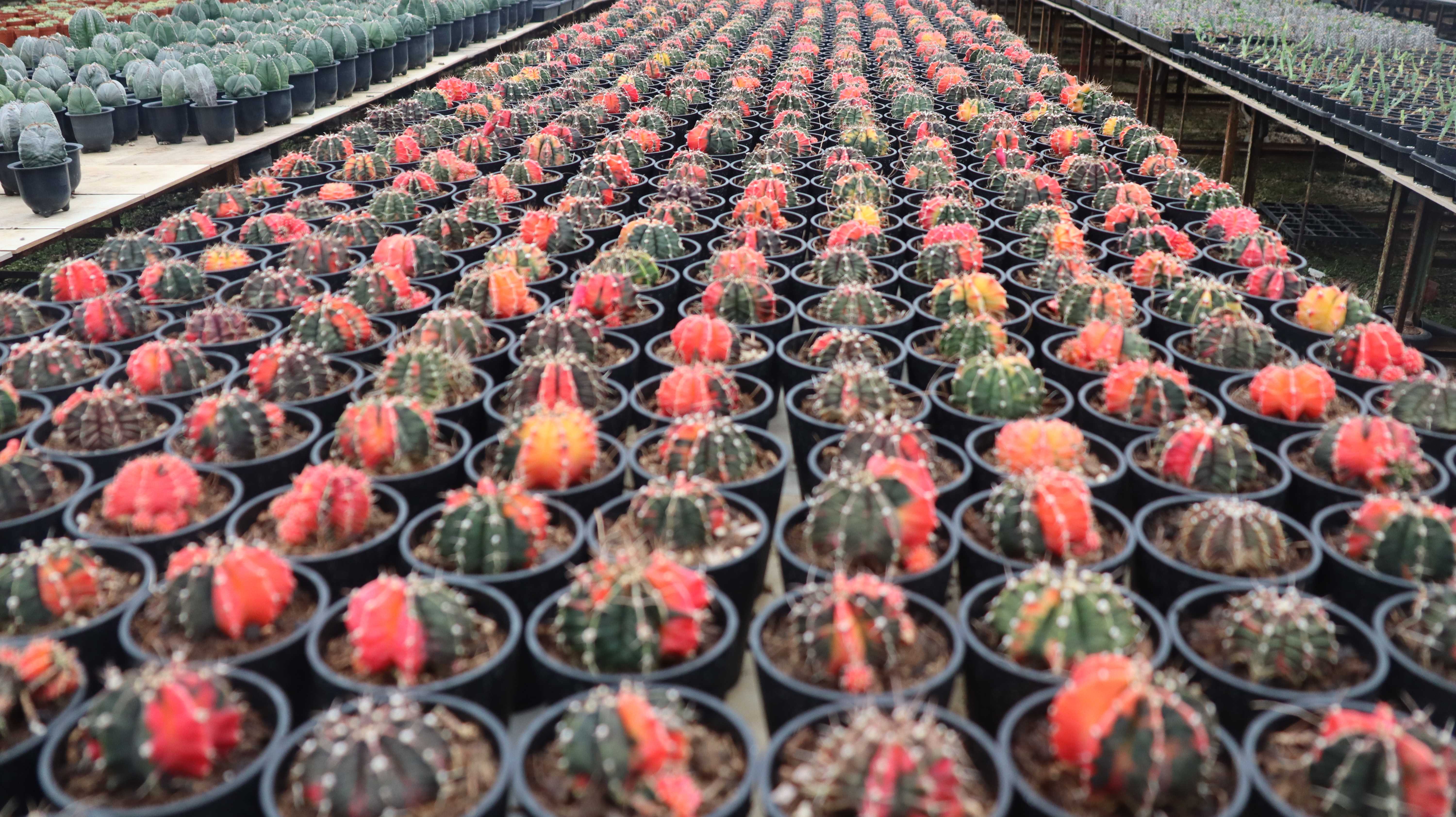 仙人掌与多肉植物生产基地占地面积约150亩,全部为智能连栋温室,年产300万柱。